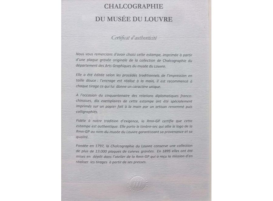 2、每幅作品都有法国文化部直属的法国国家博物馆联盟Rmn-GP的钢印 及证书(见右图)。