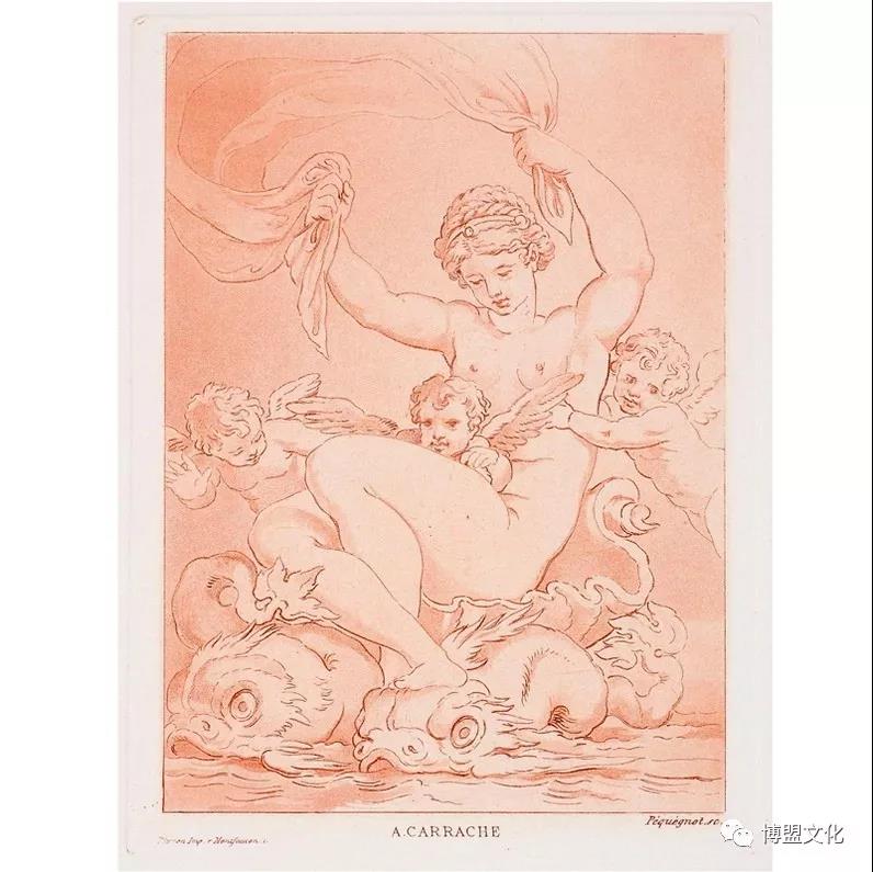 《三个天使和北螈》Annibal Carrache 1560-1609, 铜版年代19世纪 制版 Auguste Pequegnot 制版师用红色墨水颜料重现原作粉红手绘